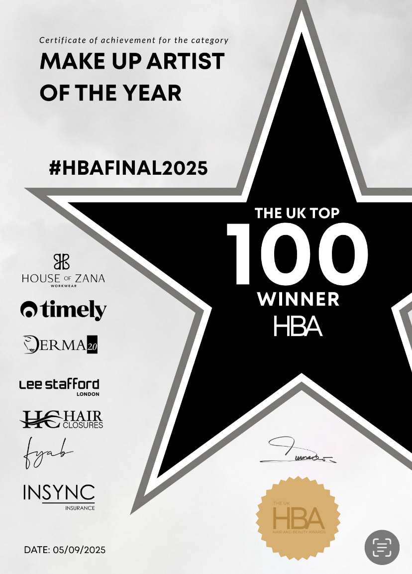 In 2025 I was placed in the Top 100 for makeup artist of the year at The Hair and Beauty Awards.